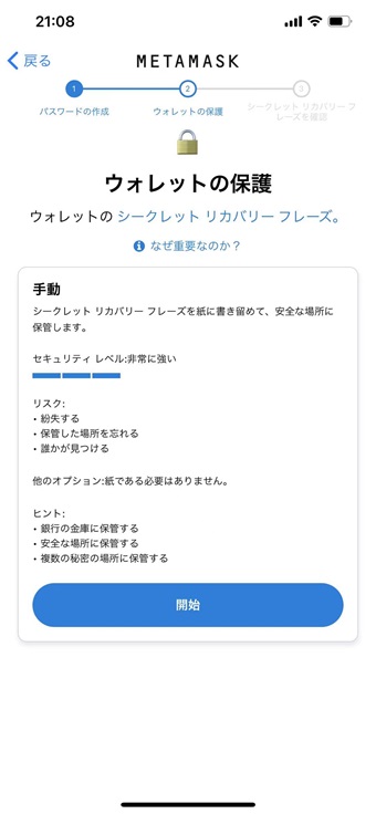 「シークレット バックアップフレーズ」は安全な場所に保管してください。シークレット バックアップフレーズを使用して、どのデバイスでもウォレットにアクセスできます。「続行」ボタンを押してください。