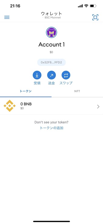 「BSC Mainnet」が表示されており,暗号化通貨記号が「BNB」が表示されます。BSCチェーン追加完了。